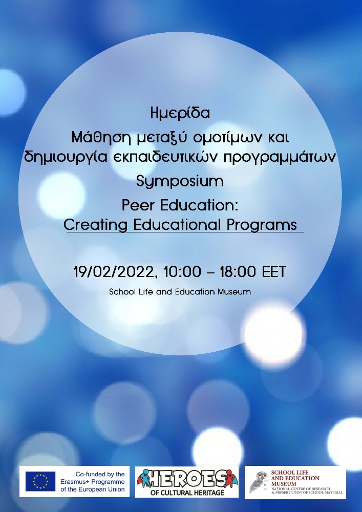 Το Μουσείο Σχολικής Ζωής και Εκπαίδευσης του ΕΚΕΔΙΣΥ διοργάνωσε την Ημερίδα διάχυσης το Σάββατο 19/02/2022 και ώρα 17:00 - 21:00 με τίτλο «Μάθηση μεταξύ ομοτίμων και δημιουργία εκπαιδευτικών προγραμμάτων» στο πλαίσιο του έργου «HEritage, cultural ROots and innovative peer Education Strategies». για το ευρωπαϊκό πρόγραμμα Erasmus + ΚΑ2 Στην εκδήλωση συμμετείχαν 50 δάσκαλοι και μουσειοπαιδαγωγοί.